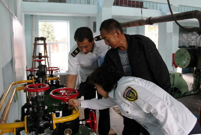 呼中区质监局执法人员对备用发电站承压钢瓶进行检查。